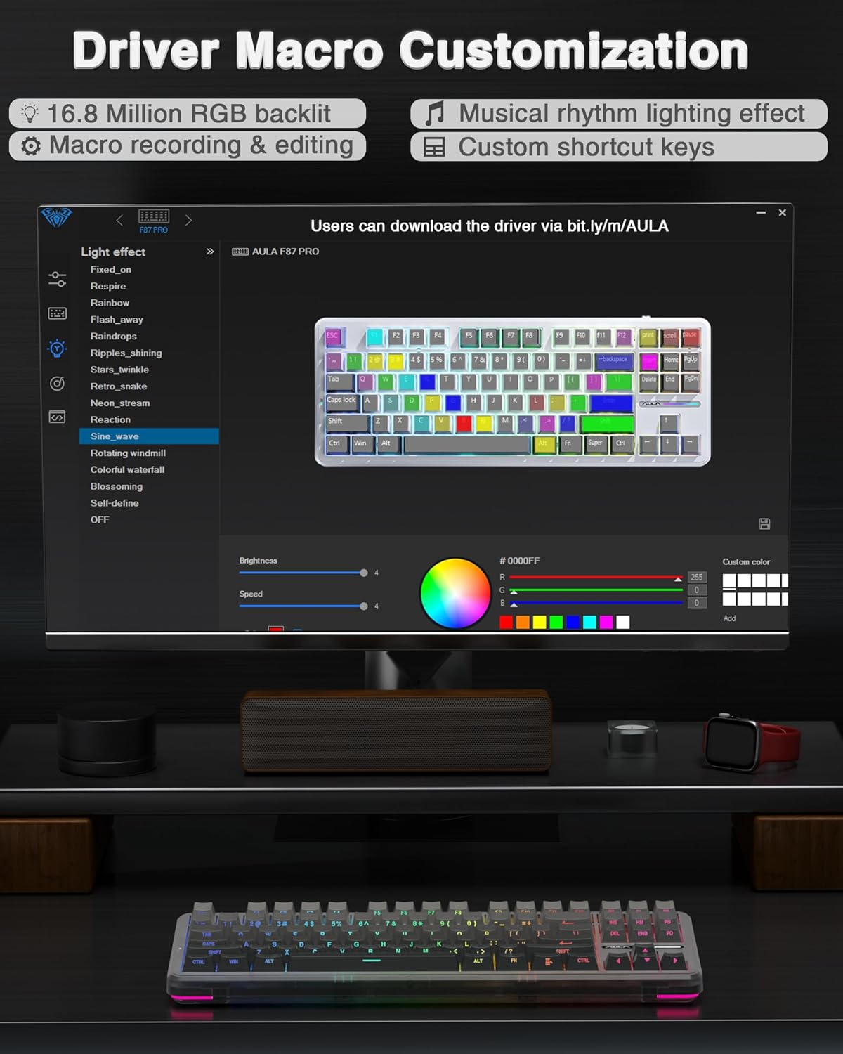 Designed as a professional gaming keyboard, the AULA F87 Pro combines functionality with style. Its compact 75% TKL layout conserves desk space while retaining essential arrow keys for gaming efficiency. The keyboard features macro programmable keys that can be customized for individual preferences, facilitating enhanced gaming strategies while improving productivity. With N key rollover and a win key lock function, users can focus on their gameplay without worry, making the F87 Pro an indispensable tool for gamers aiming for success.